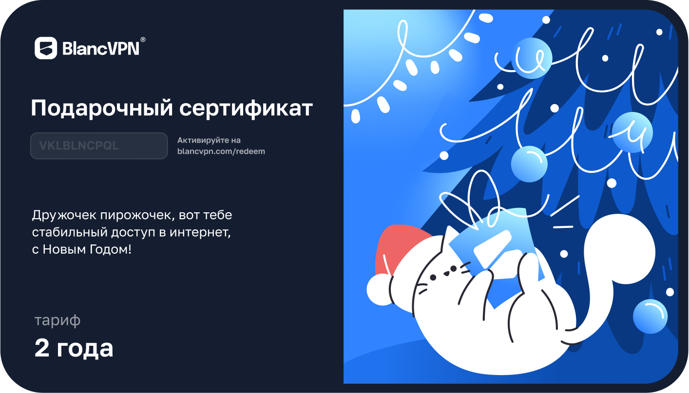 Чтобы подарить близким свободу и безопасность в интернете, воспользуйтесь новогодним сертификатом от BlancVPN:
